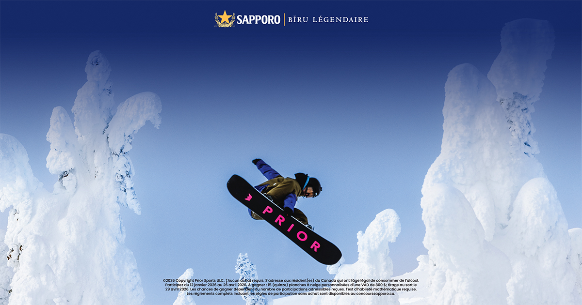 Il y a quinze (15) prix à gagner, chacun un « prix ». Chaque prix consiste en une (1) planche à neige Sapporo x Prior. La VAD de chacun des prix est de 800,00 $.